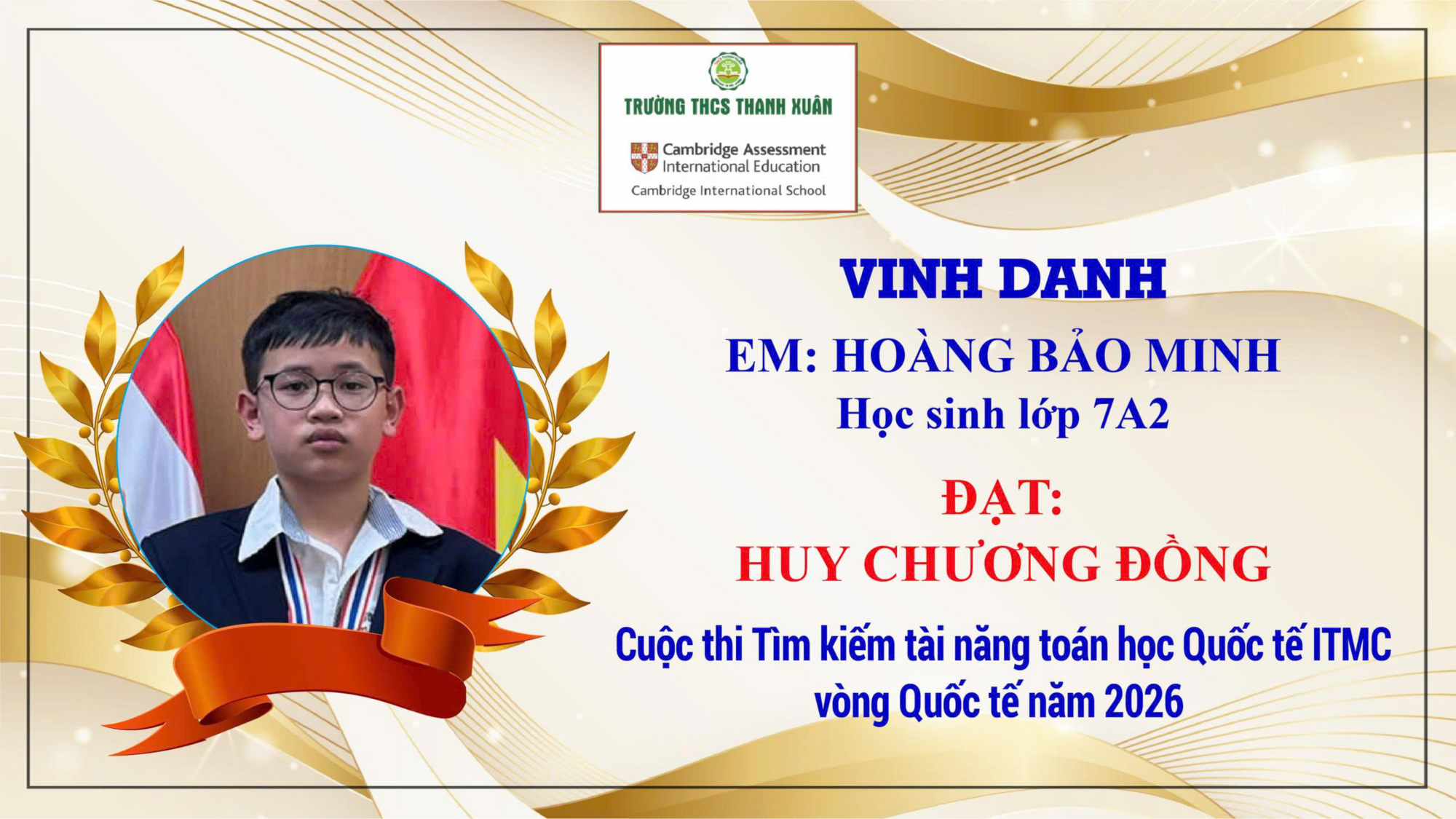 Mới đây, vào tháng 3 năm 2026, Hoàng Bảo Minh đã xuất sắc giành Huy chương Đồng tại kỳ thi Tìm kiếm Tài năng Toán học Quốc tế – ITMC, được tổ chức tại Thái Lan. Đây là một cuộc thi có quy mô quốc tế với sự tham gia của 8 quốc gia châu Á, là sân chơi để các học sinh có năng lực Toán học được giao lưu, tranh tài và khẳng định bản thân. Việc đạt được huy chương ở một kỳ thi như vậy là kết quả rất đáng khích lệ, thể hiện sự cố gắng bền bỉ của Minh trong học tập và rèn luyện tư duy.