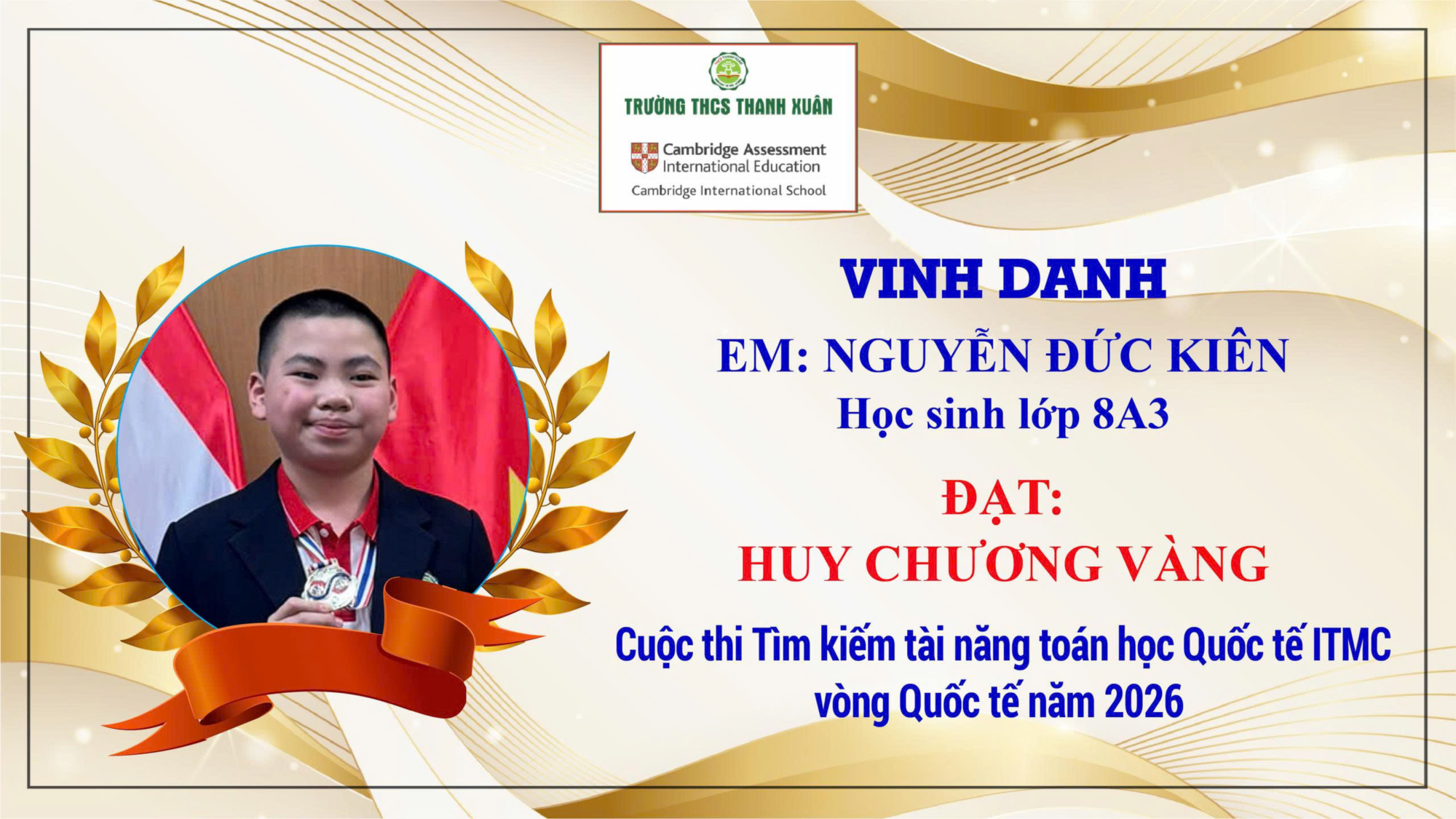 Trường THCS CLC Thanh Xuân vui mừng và tự hào chúc mừng em Nguyễn Đức Kiên - Học sinh lớp 8A3 đã xuất sắc chinh phục tấm Huy chương Vàng tại vòng Quốc tế kỳ thi Tìm kiếm Tài năng Toán học Quốc tế (ITMC) tổ chức tại Thái Lan vào tháng 3/2026.