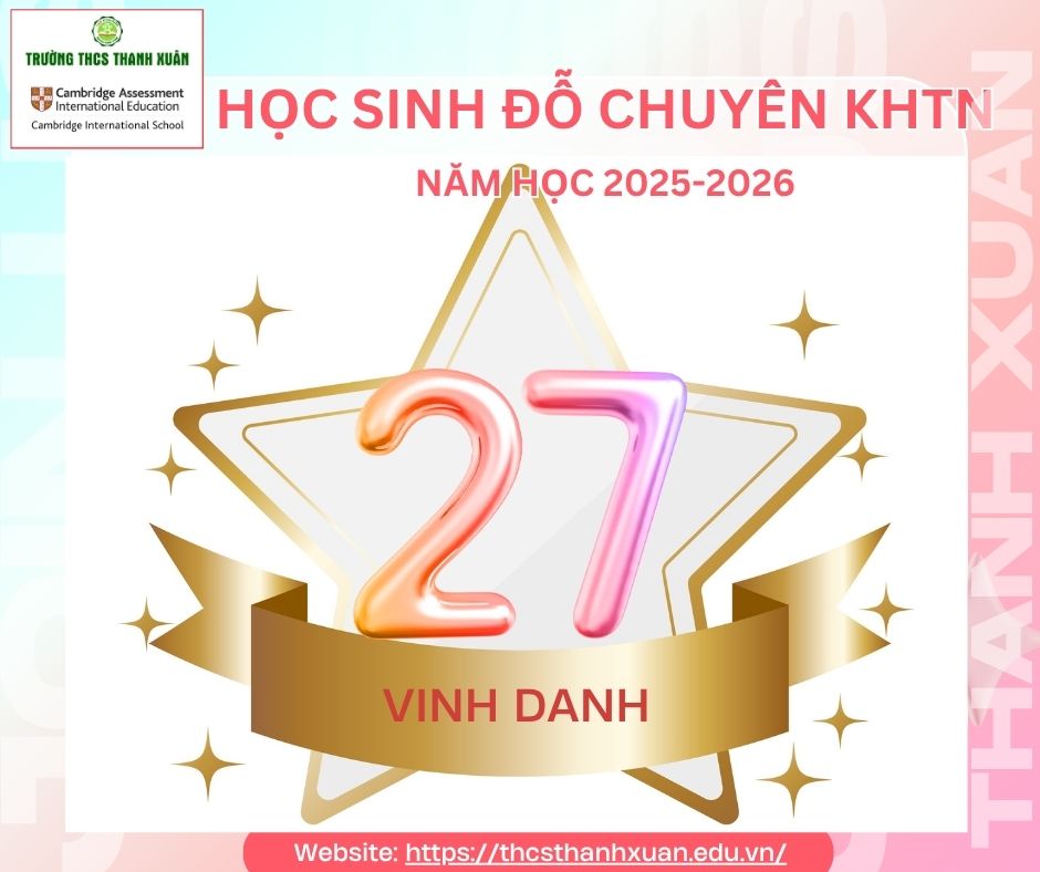 Nhà trường, các thầy giáo, cô giáo và các bạn chúc mừng thành tích đáng tự hào của 27 TXERS đầu tiên, mở màn cho kết quả thi THPT chuyên và kỳ thi vào lớp 10 năm học 2025-2026. Chúc mừng thành tích của các em, chúc mừng niềm vui và hạnh phúc của Phụ huynh học sinh - Người đồng hành bền bỉ cùng cô và trò trong suốt 4 năm học tại THCS Thanh Xuân. Chúc các em luôn tỏa sáng bằng trí tuệ, bản lĩnh và niềm tự hào mang tên THCS Thanh Xuân!