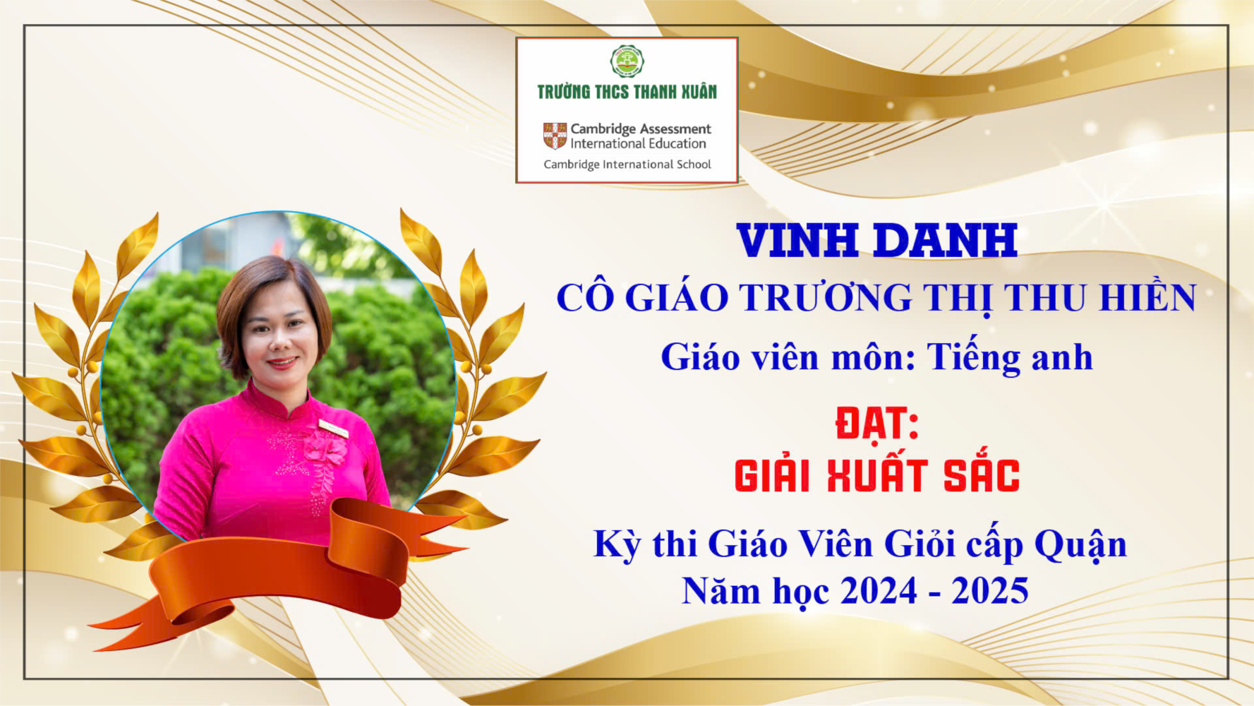 Chúc mừng cô giáo Trương Thị Thu Hiền đạt giải Xuất sắc sẽ đại diện quận Thanh Xuân tham dự kì thi Giáo viên dạy giỏi cấp Thành phố. Chúc cô giáo tiếp tục đạt được những thành tích cao để nối tiếp bảng vàng truyền thống "Thầy dạy giỏi" của trường THCS Thanh Xuân.