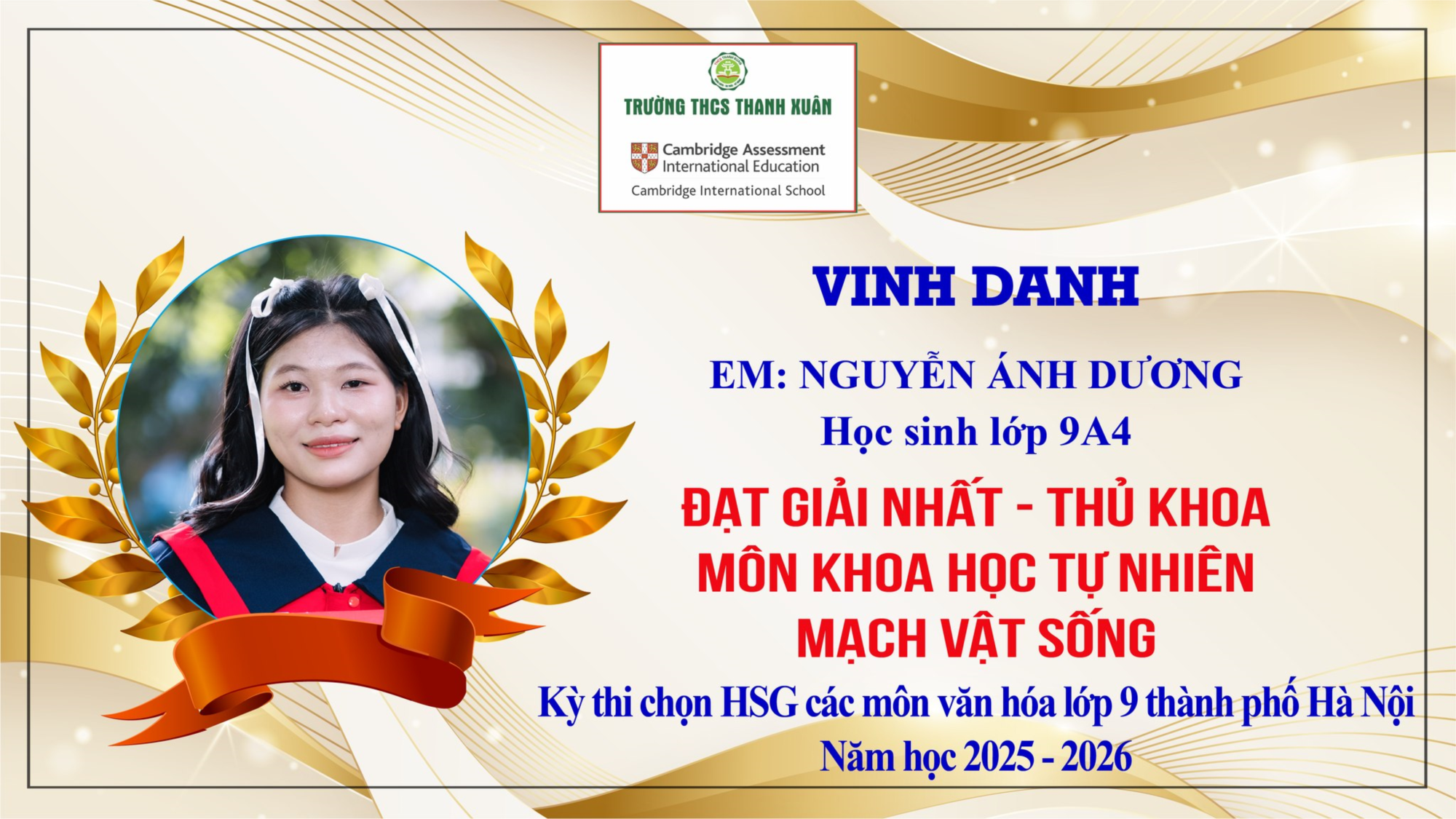 Chúc mừng em Nguyễn Ánh Dương – học sinh lớp 9A4, Trường THCS Thanh Xuân đã xuất sắc đạt giải Nhất – Thủ khoa môn Khoa học tự nhiên (phân môn Mạch vật sống) trong Kỳ thi chọn học sinh giỏi Thành phố các môn văn hóa lớp 9 năm học 2025–2026, với số điểm 18/20 đầy ấn tượng.