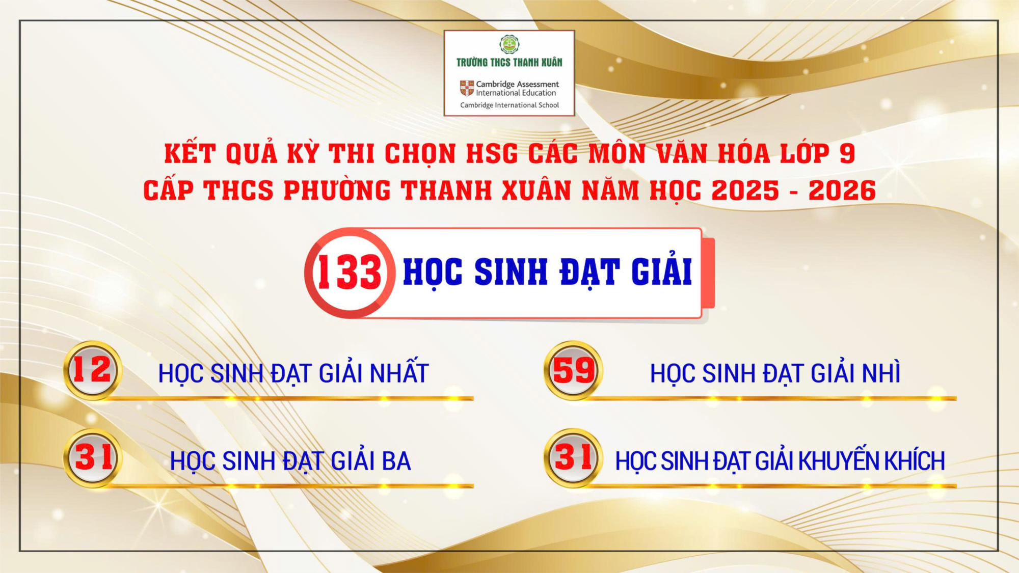Trường THCS Thanh Xuân thật vinh dự và tự hào trong năm học 2025-2026 có 53 em học sinh được chọn tham gia kì thi học sinh giỏi cấp Thành phố, điều này một lần nữa khẳng định chất lượng trong đào tạo mũi nhọn của nhà trường đạt chất lượng và hiệu quả cao. Thành tích ấy là món quà vô giá của các em học sinh tri ân các thầy cô giáo. Thành tích rực rỡ của các em, một lần nữa góp phần khẳng định chất lượng giáo dục toàn diện của trường THCS Thanh Xuân. Những thành tích ấy là những đóa hoa ngát hương dành tặng các thầy giáo, cô giáo trong Hội đồng Sư phạm nhà trường.